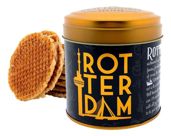 Prachtig gedecoreerd stroopwafelblik in goud en zwart, de tekst "Rotterdam" in het groot op de voorkant.