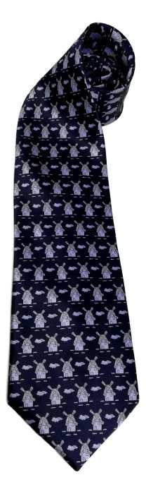 Deze blauwe stropdas is versierd met kleine Hollandse molens.