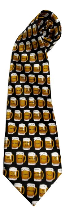 Deze vrolijke stropdas is voorzien van kleine bierglazen met "Proost" in verschillende talen.