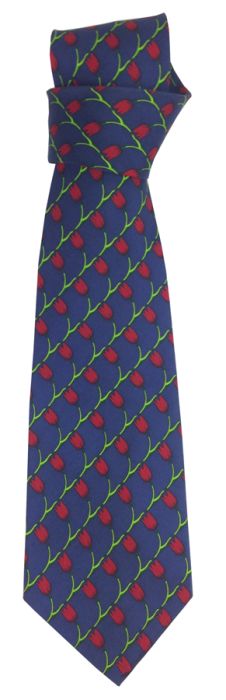 Mooie blauwe zijden stropdas met rode tulpjes.
