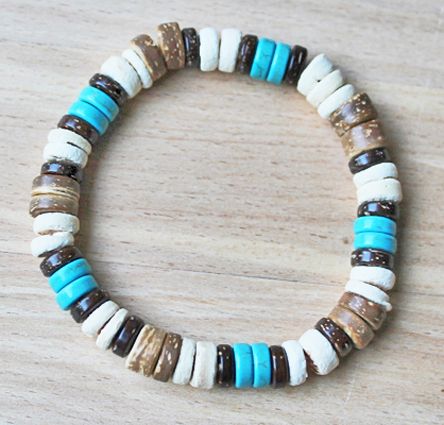Surfer armband 8mm kralen turkoois, wit en kokos bruin.
