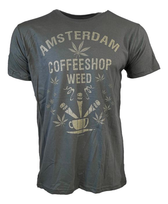 Dit donker groene t-shirt is versierd een Amsterdam coffeeshop thema en de tekst "Amsterdam Coffeeshop"