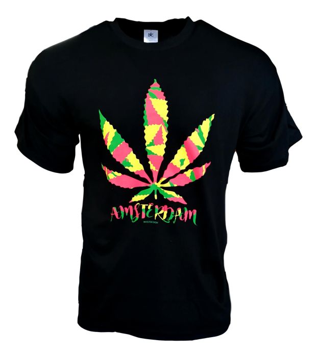 Mooi donker zwart t-shirt met daarop een groot wiet blad in de rasta kleuren en de tekst Amsterdam.
