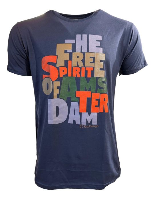 Navy blauw t-shirt versierd met glinsterend gekleurde letters met de tekst "The Free Spirit of Amsterdam".