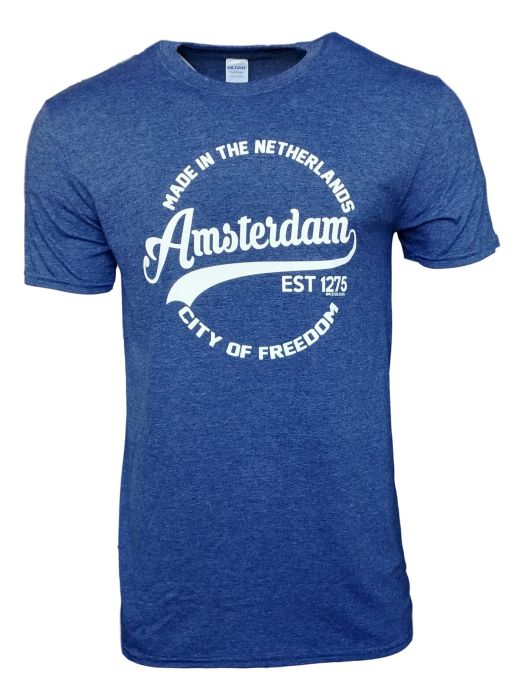 Donkergrijs t-shirt met de tekst "Amsterdam - Made in the Netherlands" op de voorkant. Het t-shirt is gemaakt van 100% katoen. Verkrijgbaar in de maten S, M, L en XL.