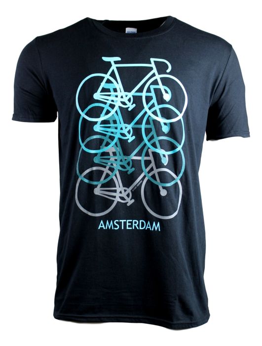 Zwart t-shirt met vier fietsen en de tekst Amsterdam.
