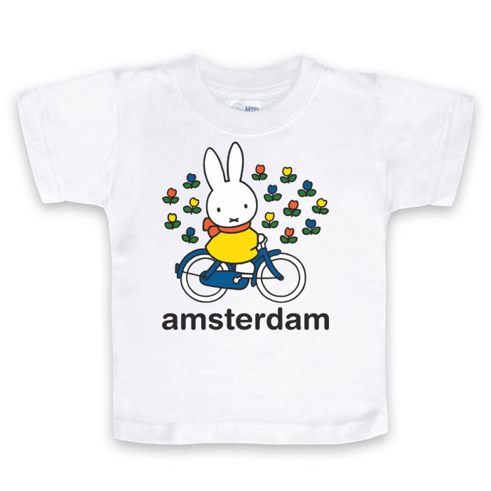 Wit Nijntje kinder T-Shirt versierd met Nijntje met op de fiets in en gekleurd tulpenveld en de tekst "Amsterdam".