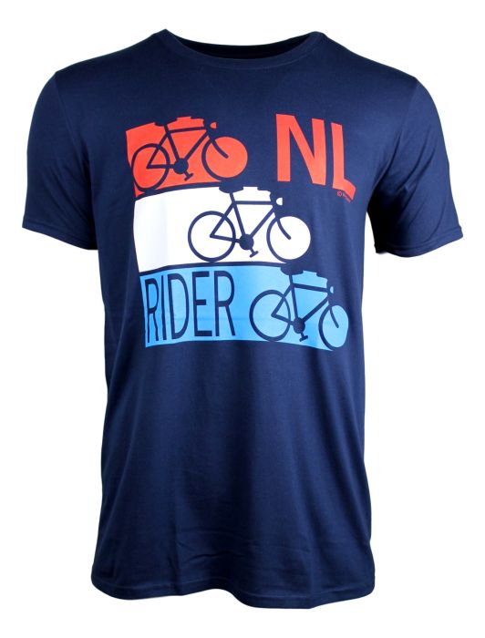 In Nederland fiets je , en dat laat dit T-shirt zien. Een Navy blauw t-shirt met de Nederlandse driekleur gecombineerd met fietsen en de tekst "NL Rider".