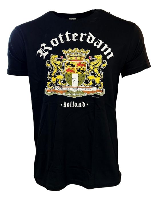 Zwart t-shirt met het wapen van de stad Rotterdam (Sterker door Strijd) in felle kleuren op de borst.