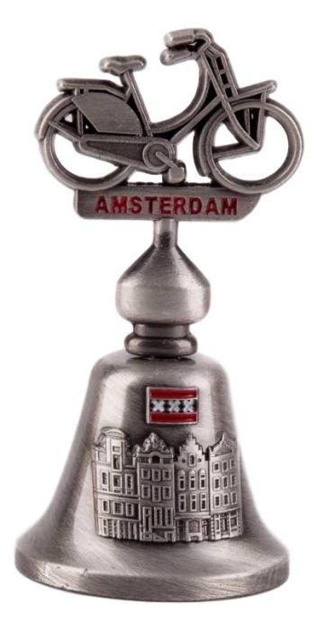 Tinkleurige kleine tafelbel versierd met een fiets, de vlag van Amsterdam en een grachten versiering op de bel.