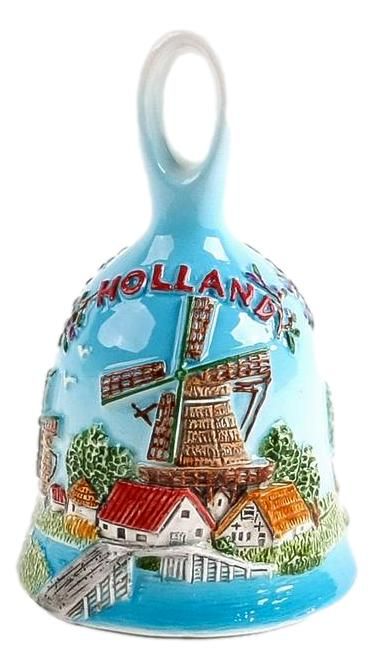 Deze kleurrijke keramiek tafelbel toont een schilderachtig Nederlands landschap met iconische elementen. De bel is versierd met een traditionele windmolen, typische Nederlandse huisjes met rode daken en een waterlandschap, allemaal in levendige kleuren tegen een blauwe achtergrond.