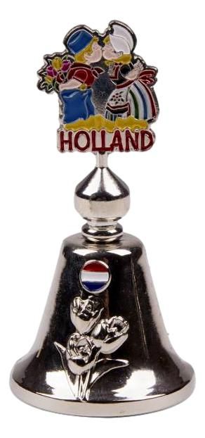 Kleine tafelbel om met een klingel het avondeten in te luiden. Deze is zilverkleurig en versierd met een kleurig kussend paar aan de bovenkant.