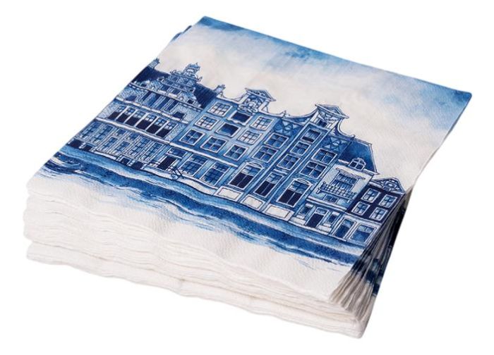 Servetten versierd met een Amsterdamse grachtenpanden in Delfts blauw.