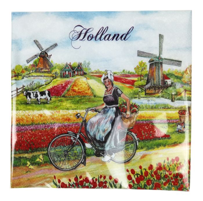 Pakje papieren servetten met een vrouw in klederdracht op de fiets in een molenlandschap.