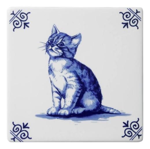 Mooie tegel in klassiek ontwerp met daarop een poesje. In elk van de hoeken is een oud Hollands motief te vinden.