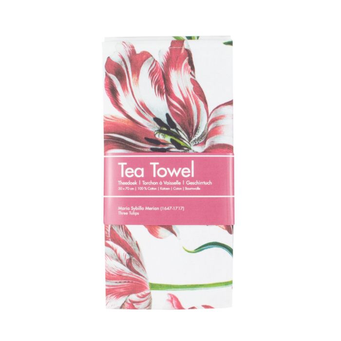 Mooie theedoek versierd de tulpen van Maria Sybilla Merian (1647-1717). Haar werk is te zien in Teylers museum in Haarlem.