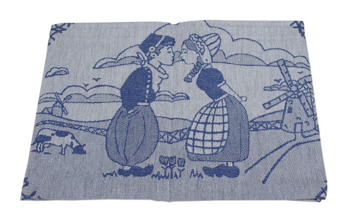 Theedoek in mooie blauwe kleur met afbeelding van een boer en boerin. Gemaakt door Twentse Damast, sinds 1813 leverancier van hoogwaardige textielproducten. Materiaal: 100% katoen Afmetingen zijn 58 x 64cm