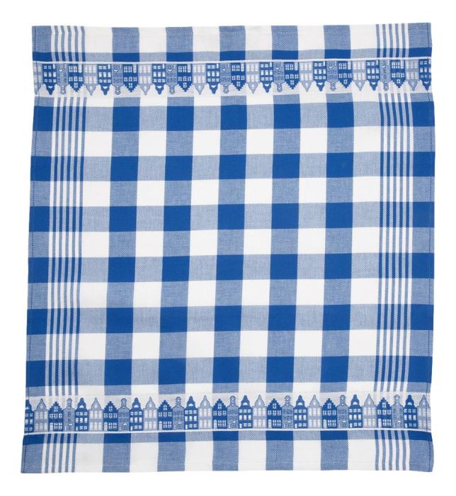 Theedoek in mooie blauwe kleur met een typisch blauw/wit blok patroon en grachtenhuisjes rond de randen.