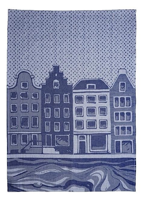 Deze theedoek is versierd met een rij karakteristieke grachtenpandjes rechtstreeks uit het bruisende Amsterdam.