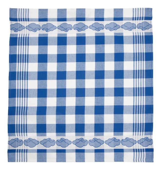 Theedoek in mooie blauwe kleur met een typisch blauw/wit blok patroon en klompjes rond de randen.