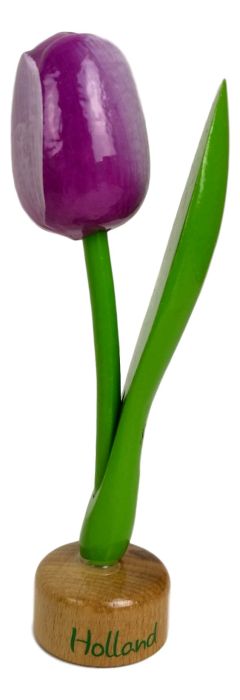 Deze paars met wit gekleurde tulp staat op een houten voetje. Het voetje heeft de tekst "Holland".