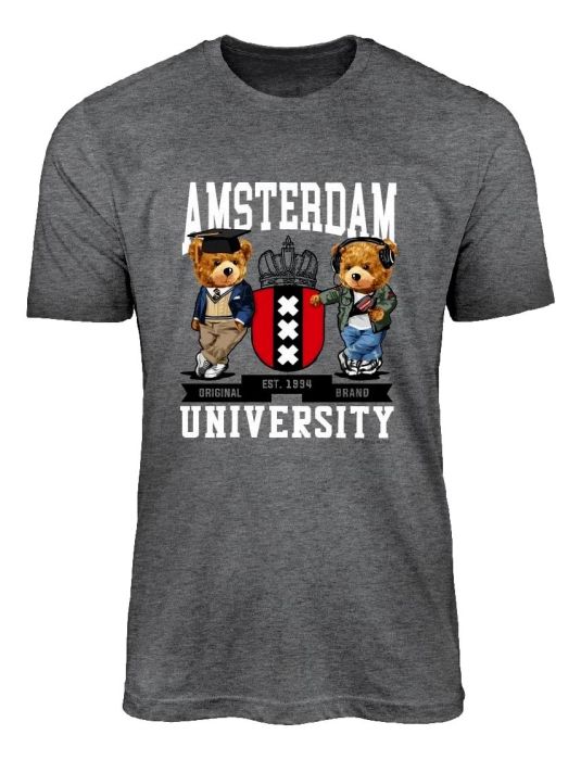 Twee teddybeertjes versiering dit grijze t-shirt met de tekst "Amsterdam University" in grote witte letters.