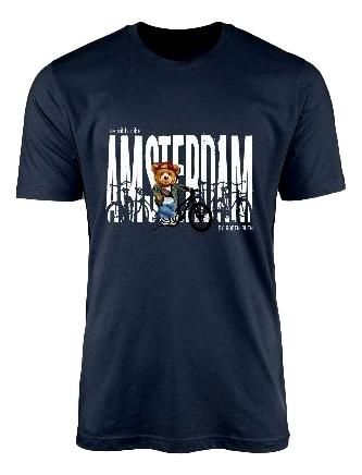 Navy t-shirt versierd met de tekst Me With Bike - Amsterdam en een beer met fietsen.