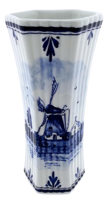Dit handbeschilderde kleine bloemenvaasje heeft een geribbelde buitenkant en een 6 kantige vorm en is versierd met een molen landschap aan de voorkant en een bloem aan de achterkant.