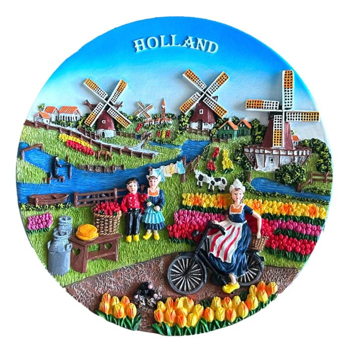 Dit wandbord is kleurrijk versierd met een 3D tafereel van Nederlandse windmolens en boerenlandschap. Het bord wordt geleverd in een kartonnen doos.