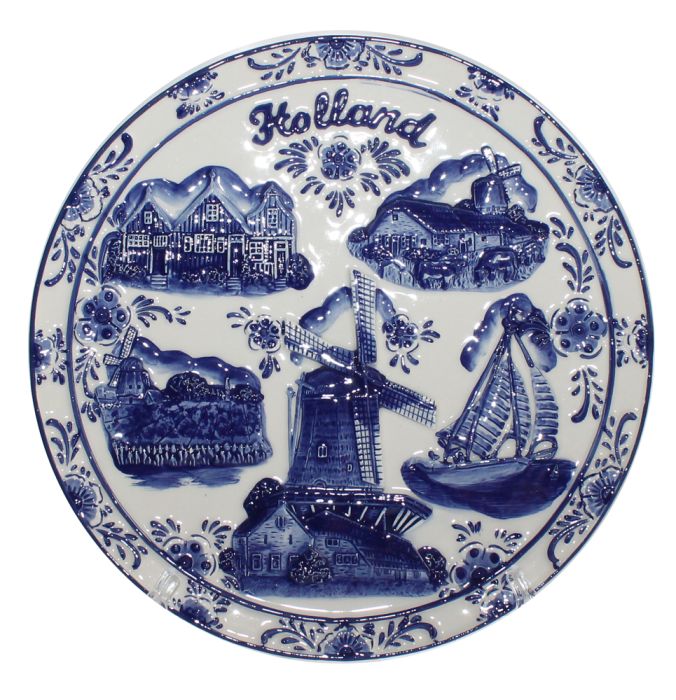 Ronde tegel met in relief allerlei Hollandse symbolen zoals een molen, een zeilboot etc.