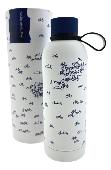 Blijf fris in stijl met de elegante Delfts Blauwe fietsen waterfles. Deze prachtig ontworpen fles heeft een print met heel veel kleine fietjes.