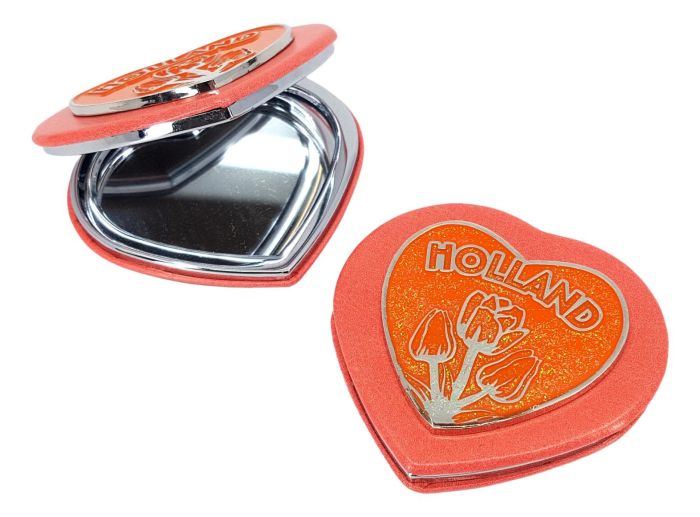 Dit metalen spiegeldoosje is de perfecte combinatie van functionaliteit en schoonheid. De buitenkant van het doosje is vakkundig gedecoreerd met een prachtig oranje hartje, dat is versierd met mooie tulpen en de tekst "Holland".